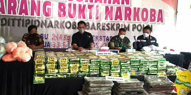“Totalnya ada 244 kilogram sabu dengan kemasan teh China, 13.800 gram ganja, 200 ribu pil ekstasi dan 47.500 butir pil erimin atau H-5,” kata Dittipidnarkoba Bareskrim Polri, Brigjen Pol Krisno Siregar dalam konferensi pers di RSPAD Gatot Soebroto.