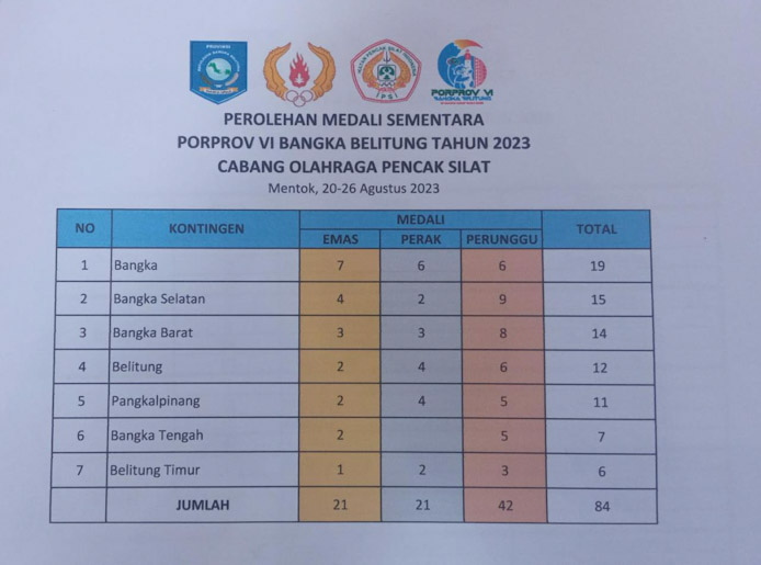 Secara total pencak silat Bangka memperoleh 7 emas, 6 perak dan 6 perunggu. Juara umum II dari Bangka Selatan 4 emas, 2 perak dan 9 perunggu, Bangka Barat 3 emas, 3 perak dan 8 perunggu.(ry)
