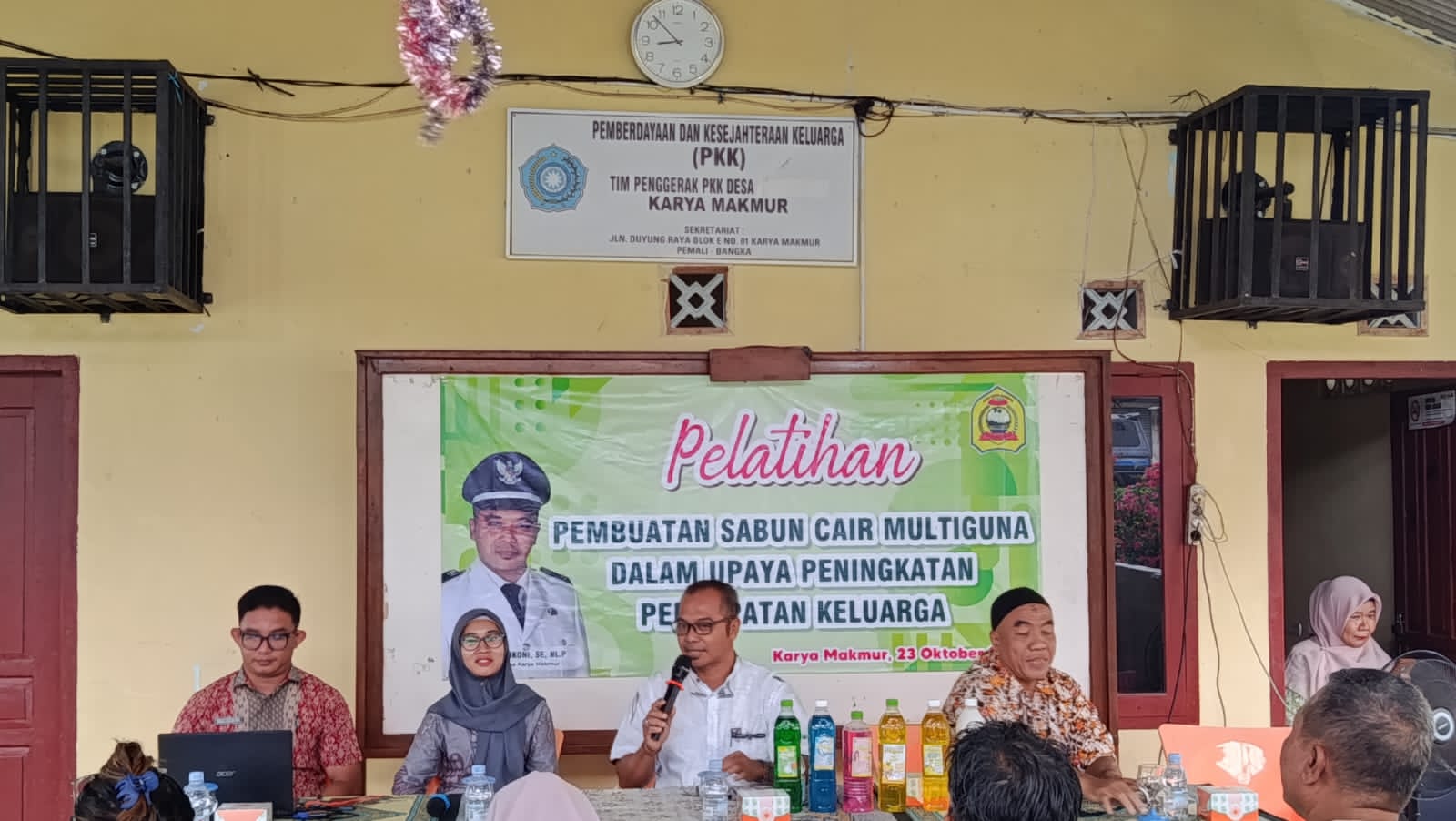 Bangka – Pemerintah Desa (Pemdes) Karya Makmur bekerja sama dengan CV. Multi Gemilang Group Sungailiat melaksanakan pelatihan pembuatan sabun cair multiguna, bertempat di Balai Desa Karya Makmur, Kamis (23/10/2025).