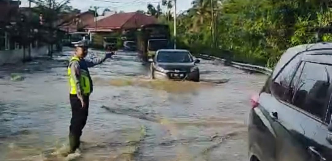 Merlung – Luapan air Sungai Merlung mulai menggenangi badan jalan di Lintas Timur Sumatera, tepatnya di KM 120, Kelurahan Merlung, Kabupaten Tanjung Jabung Barat. Personel kepolisian kini disiagakan di lokasi guna mengantisipasi kemacetan dan memastikan keamanan pengguna jalan, Sabtu (3/1/2026).
