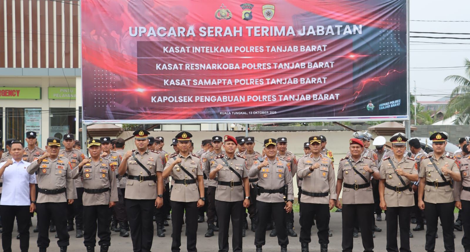 Kuala Tungkal – Kepolisian Resor (Polres) Tanjung Jabung Barat (Tanjab Barat) melaksanakan upacara Serah Terima Jabatan (Sertijab) bagi empat pejabat utama, di Halaman Mapolres, Senin (13/10/2025). Upacara dipimpin langsung oleh Kapolres Tanjab Barat AKBP Agung Basuki, S.I.K., M.M.