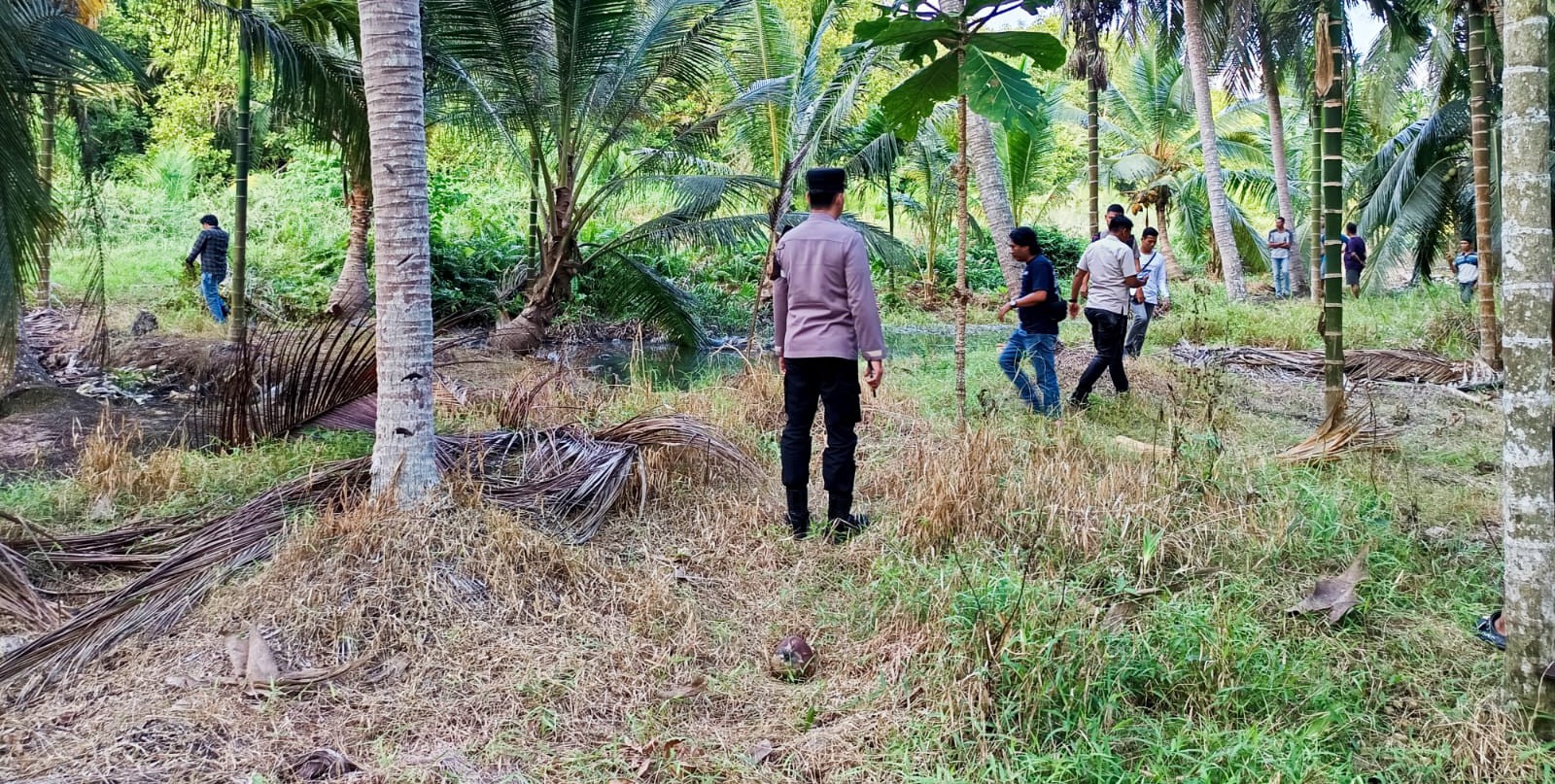 Sesosok mayat laki-laki ditemukan terbujur kaku di dalam kanal perkebunan kelapa milik warga sekitar pukul 17.00 WIB.