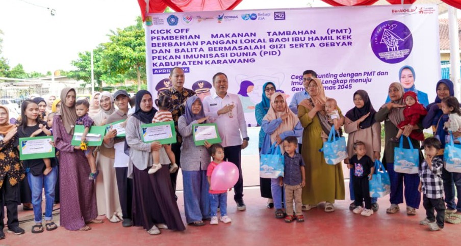 Karawang – Wakil Bupati (Wabup) Karawang H. Maslani secara resmi membuka kegiatan Kick Off Pemberian Makanan Tambahan (PMT) Berbahan Pangan Lokal bagi Ibu Hamil dengan Kekurangan Energi Kronis (KEK) dan Balita bermasalah gizi dipadukan dengan Gebyar Pekan Imunisasi Dunia (PID) Kabupaten Karawang tahun 2026, bertempat di Desa Gintungkerta, Klari, Kamis (9/4/2026).